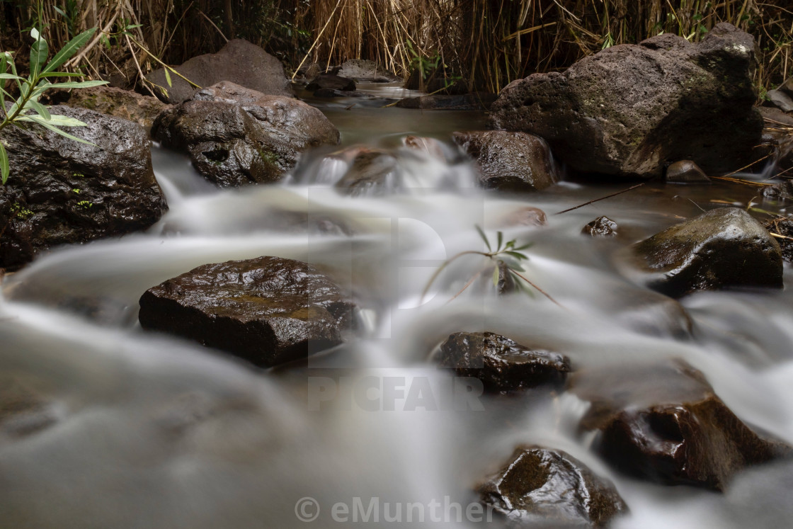 A long exposure shot of running water between the rocks..